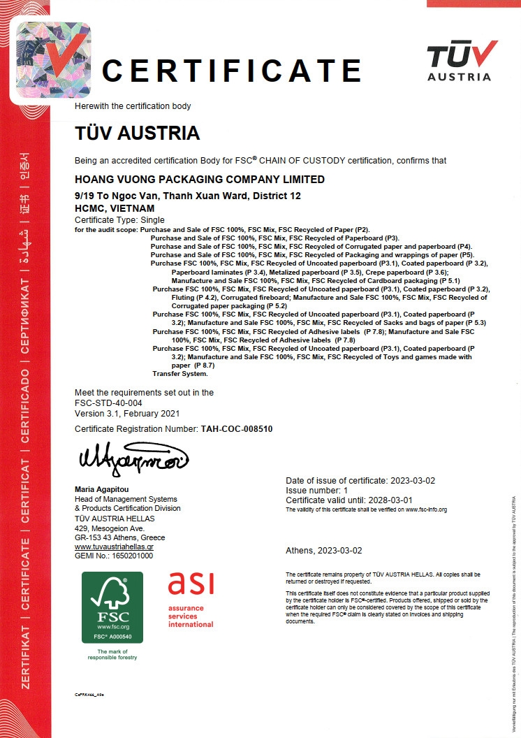 Operating under the motto “Pioneer quality”, Hoang Vuong Paper Packaging always aims for environmentally friendly and sustainable packaging solutions. We are proud to be a Vietnamese packaging manufacturer that achieves strict quality standards such as: ISO 9001:2015; FSC certification: FSC-C187470; GMI certification; G7 certification.