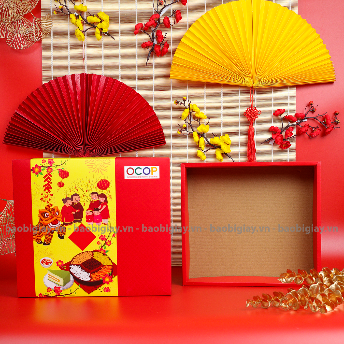 - (4) Hộp giấy đựng quà Tết bằng giấy Couche: Hộp giấy đựng quà Tết bằng giấy Couche có độ bóng cao, màu sắc tươi sáng, thích hợp với các sản phẩm quà tặng nhỏ, như bánh kẹo, trái cây sấy, hạt dinh dưỡng, thực phẩm khô đóng gói, socola và câu đối đỏ ngày Tết.